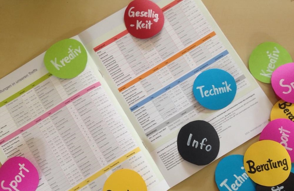 In der nächsten Zeit planen wir farblich angepasste Holzsticker, ausgesägt aus Pappelholz herzustellen, die die Farben der Oberbegriffe aus unserem Veranstaltungsprogramm aufnehmen – z. B. grüne Holzsticker für den Bereich Kreativität und rote für den Bereich Geselligkeit usw. Wir möchten dadurch erreichen, dass man schon von weitem erkennen kann, zu welchem Thema es einen neuen Aushang gibt.
