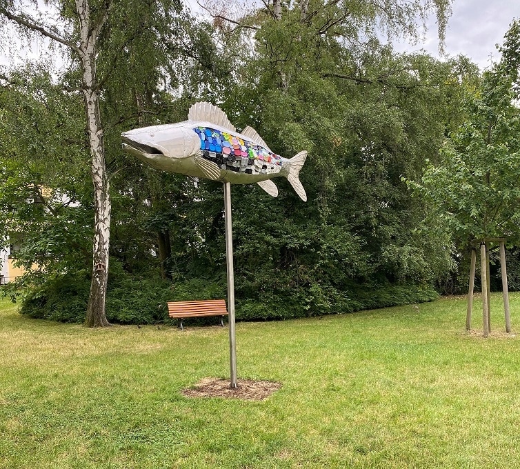 Die Skulptur wurde im Juli 2023 fertiggestellt und am 18. Juli auf der Wiese hinter den ungeraden Hauseingangsnummern Monschauer Weg aufgestellt. Es handelt sich um eine ca. 3 m hohe Skulptur, die sich im Wind dreht. Die Plastikflaschen im Upcyclingfisch stehen als Synonym für unsere Ozeane, die im Plastikmüll versinken. Mehrere hunderttausende Teile Mikroplastik je Quadratkilometer verschmutzen unsere Meere und schaden den Meeresbewohnern. Zudem landen die Plastikteile über den Fischfang auf unseren Tellern.