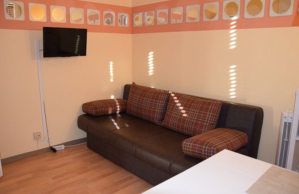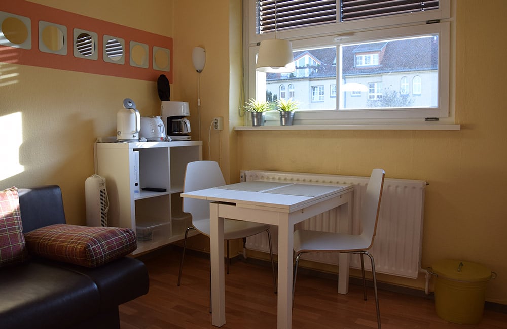 Bei der Gästewohnung in der Franz-Körner-Str. 61 a handelt es sich um ein kleines Appartement für 1-2 Personen. Die Wohnung befindet sich im Waschhausgebäude, in Hochparterre. Sie verfügt über einen kleinen Eingangsbereich, von dem ein Raum von ca. 15 m² und ein Duschbad abgehen. Im Wohnraum befindet sich die Ausziehcouch mit einer Liegefläche von 1,60 x 2,00 m.