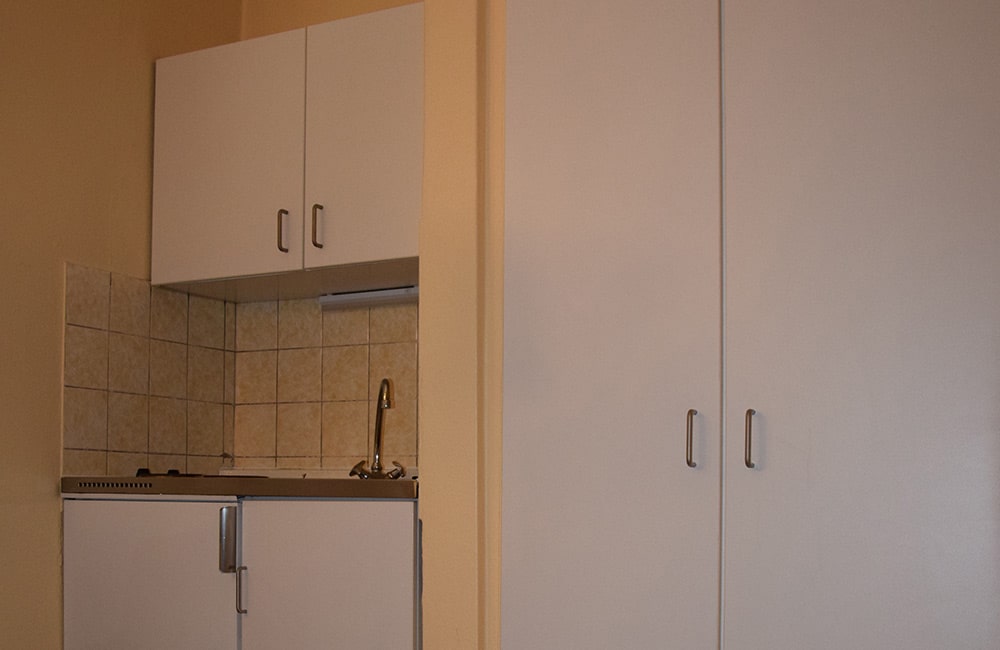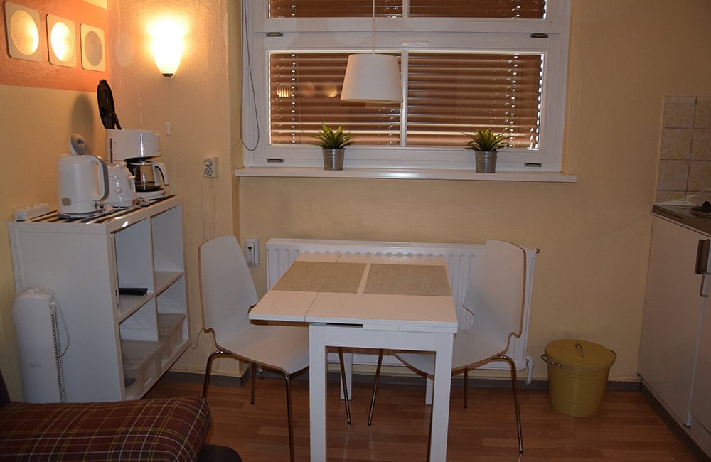 Hier finden Sie auch die kleine, gut ausgestattete Küchenzeile und den Essplatz. Kaffeemaschine, Wasserkocher, Kühlschrank, Toaster und 2-Plattenherd gehören selbstverständlich dazu, wie der kleine Fernseher. Der Bäcker und Restaurants sind fußläufig zu erreichen.