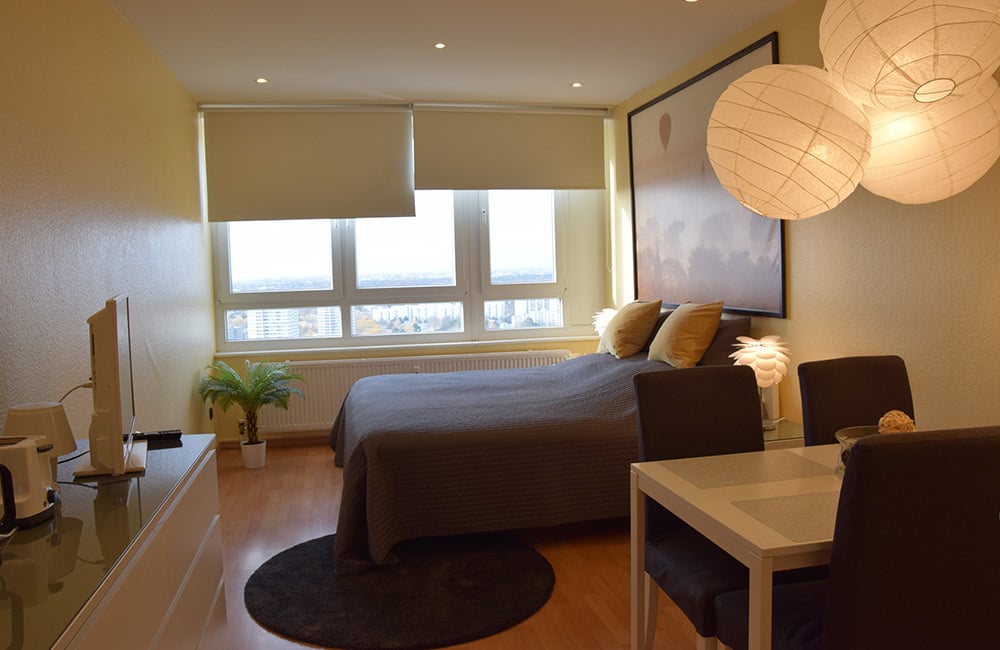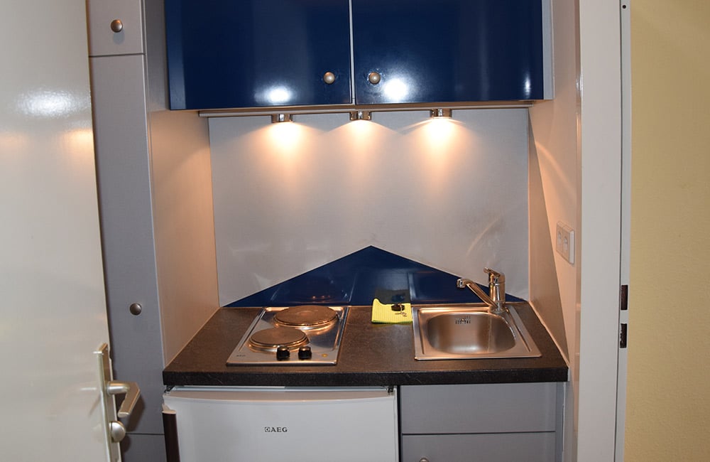 Die erste Gästewohnung in der Fritz-Erler-Allee 120 befindet sich im 30. Obergeschoss und ist für 2-3 Personen geeignet. Mit dem Aufzug fahren Sie bis in die 29. Etage und laufen dann noch eine Treppe nach oben. Im Flur der Wohnungen befindet sich eine kleine praktische Küchenzeile, mit einem 2-Platten-Herd, Kühlschrank, Toaster, Kaffeemaschine und Wasserkocher.