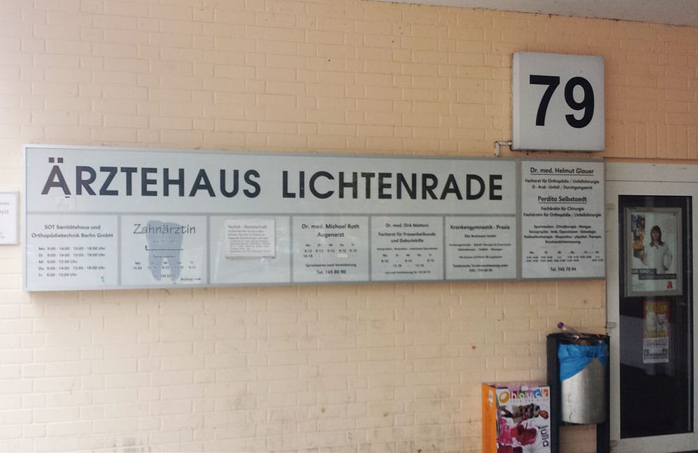 Die Bewohner von Lichtenrade finden hier eine Augenklinik, eine Zahnarztpraxis, eine Facharztpraxis für Gynäkologie sowie eine Facharztpraxis für Orthopädie, Unfallchirurgie und Chirurgie sowie weitere Einrichtungen.